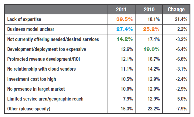 During the spring/summer 2012 I did some research in the VAR/MSP channel and one of the findings was that a key obstacle for many VARs and MSPs specifically in moving the cloud business is lack of expertise and the business model was seen to be unclear like can be seen in following picture (Source: CTTA 2012):